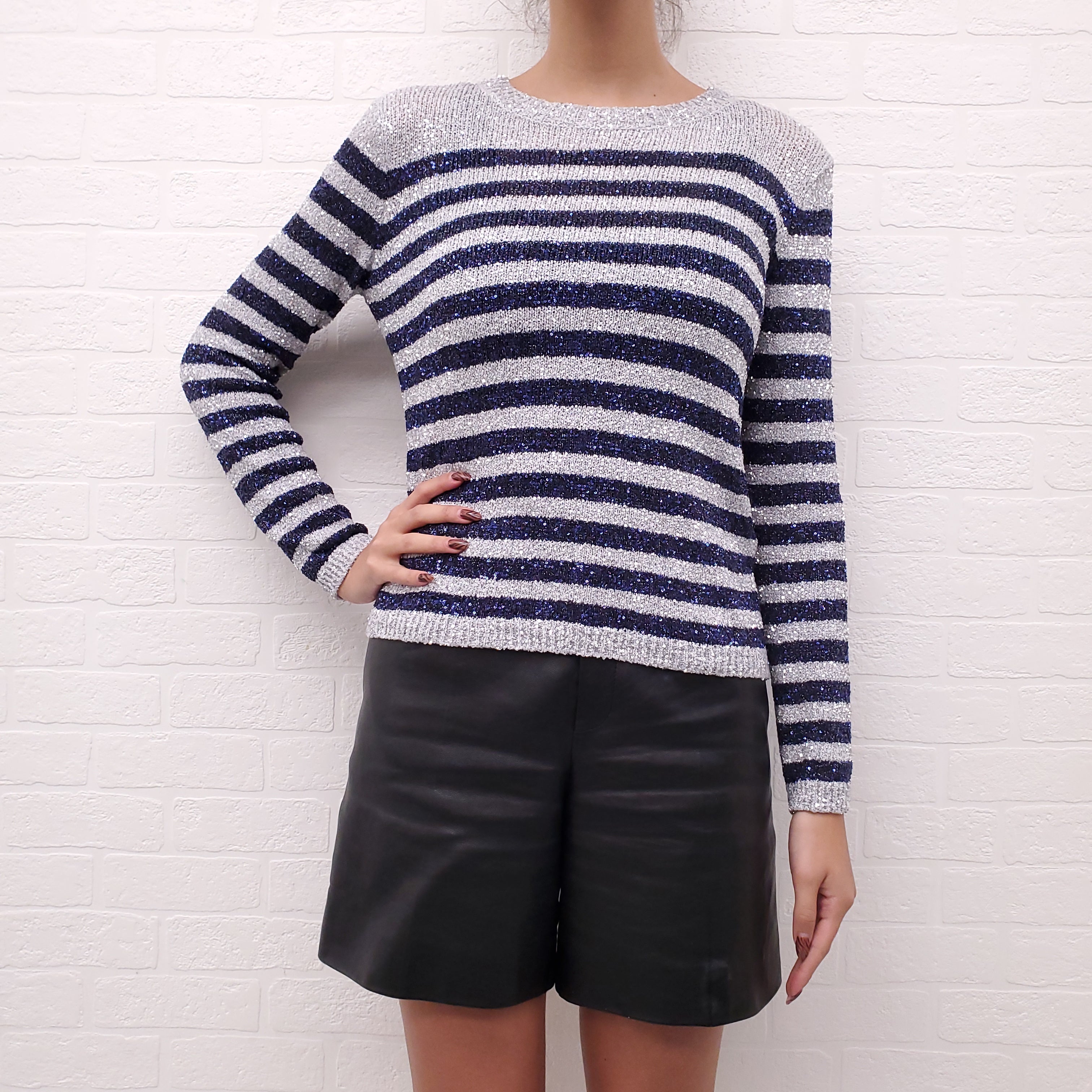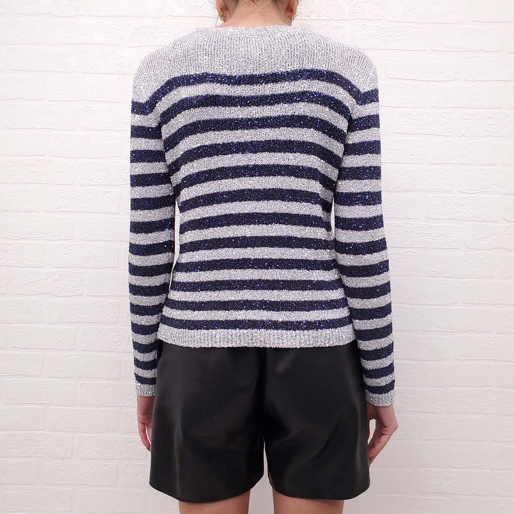 SAINT LAURENT SILVER AND NAVY STRIPED SEQUIN SWEATER - SIZE S