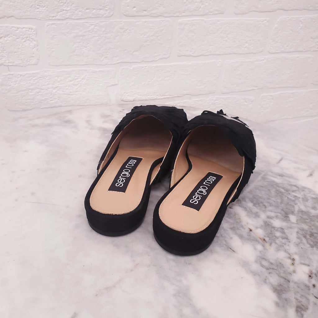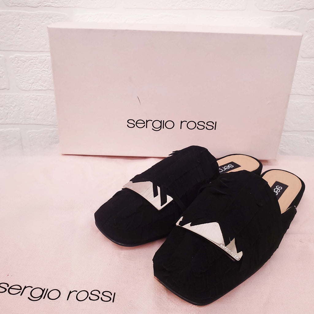 SERGIO ROSSI BLACK SUEDE FRINGE SLIDES - SIZE 35