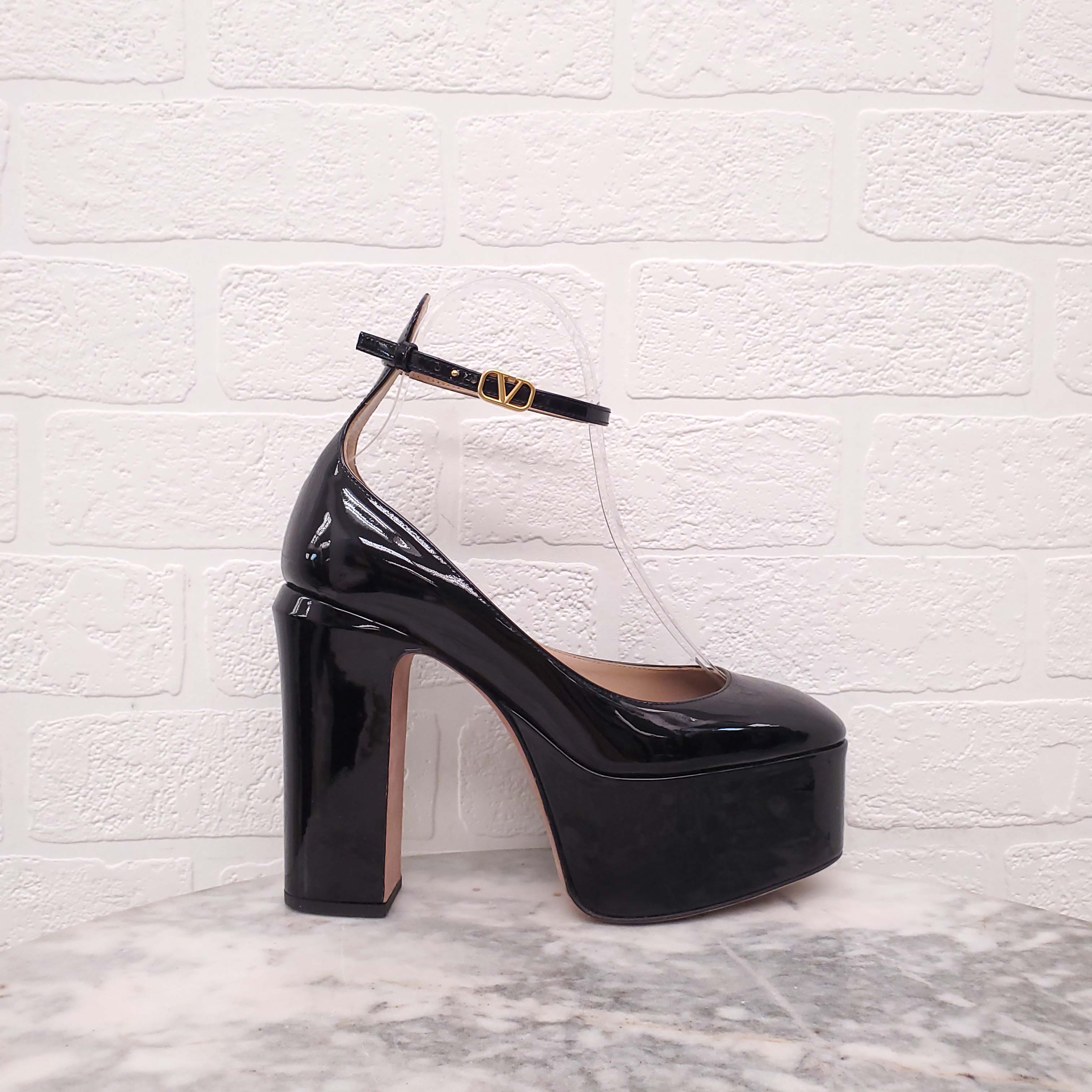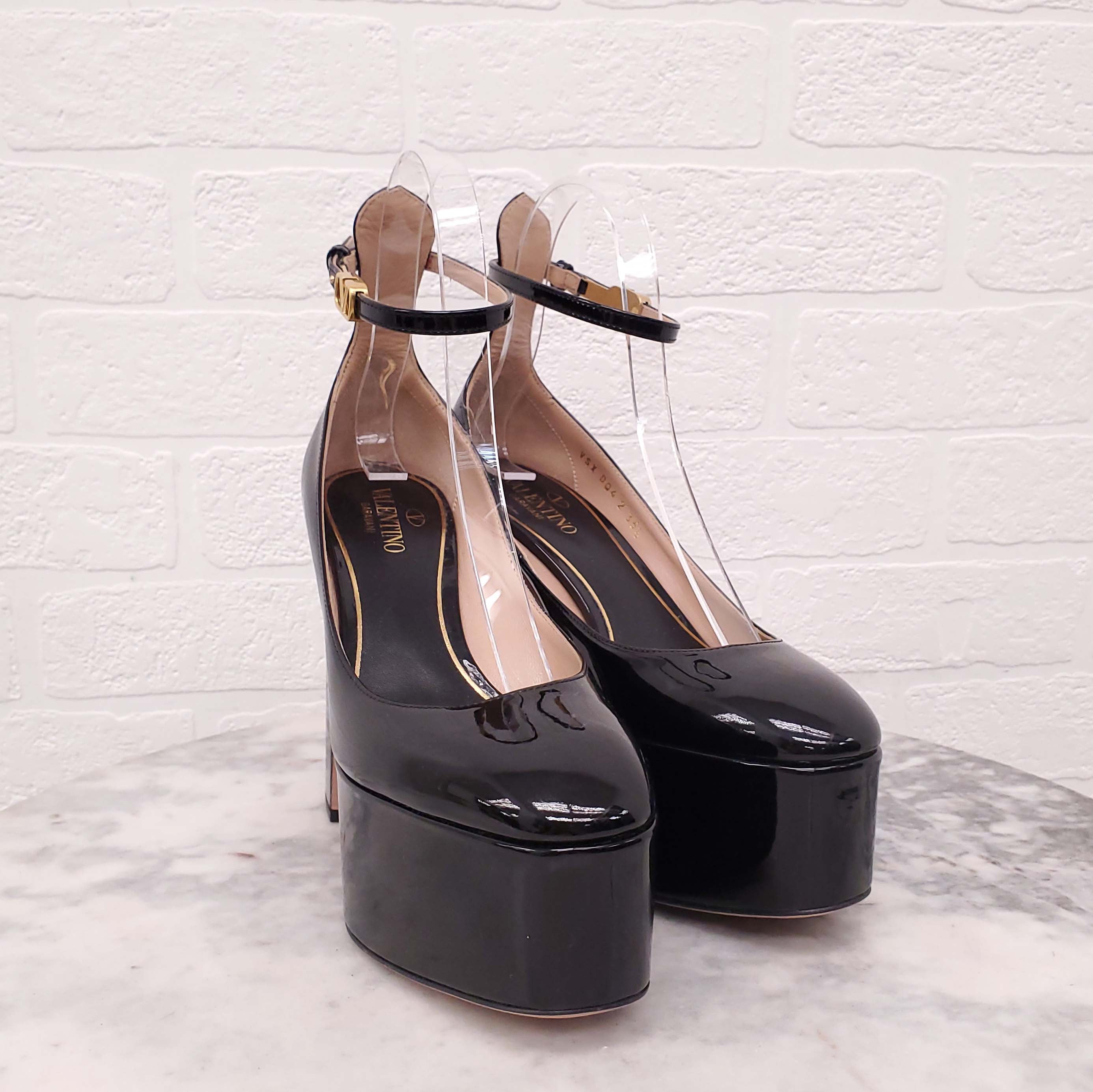 VALENTINO BLACK PATENT 'TAN-GO' PLATFORM HEELS WITH LOGO STRAP - SIZE 35.5